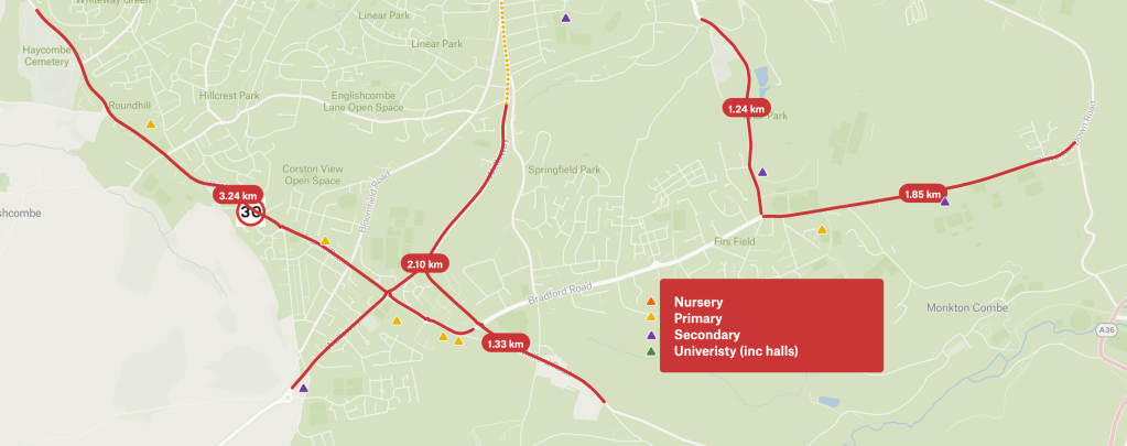 And this is just the schools. Factor in other destinations such as Haycombe Cemetery, GP surgeries, dentists, shops… this is a road that should be safe for people, because it is used intensively by people who live in the area. Instead, we have a wall of traffic that at times divides the community.